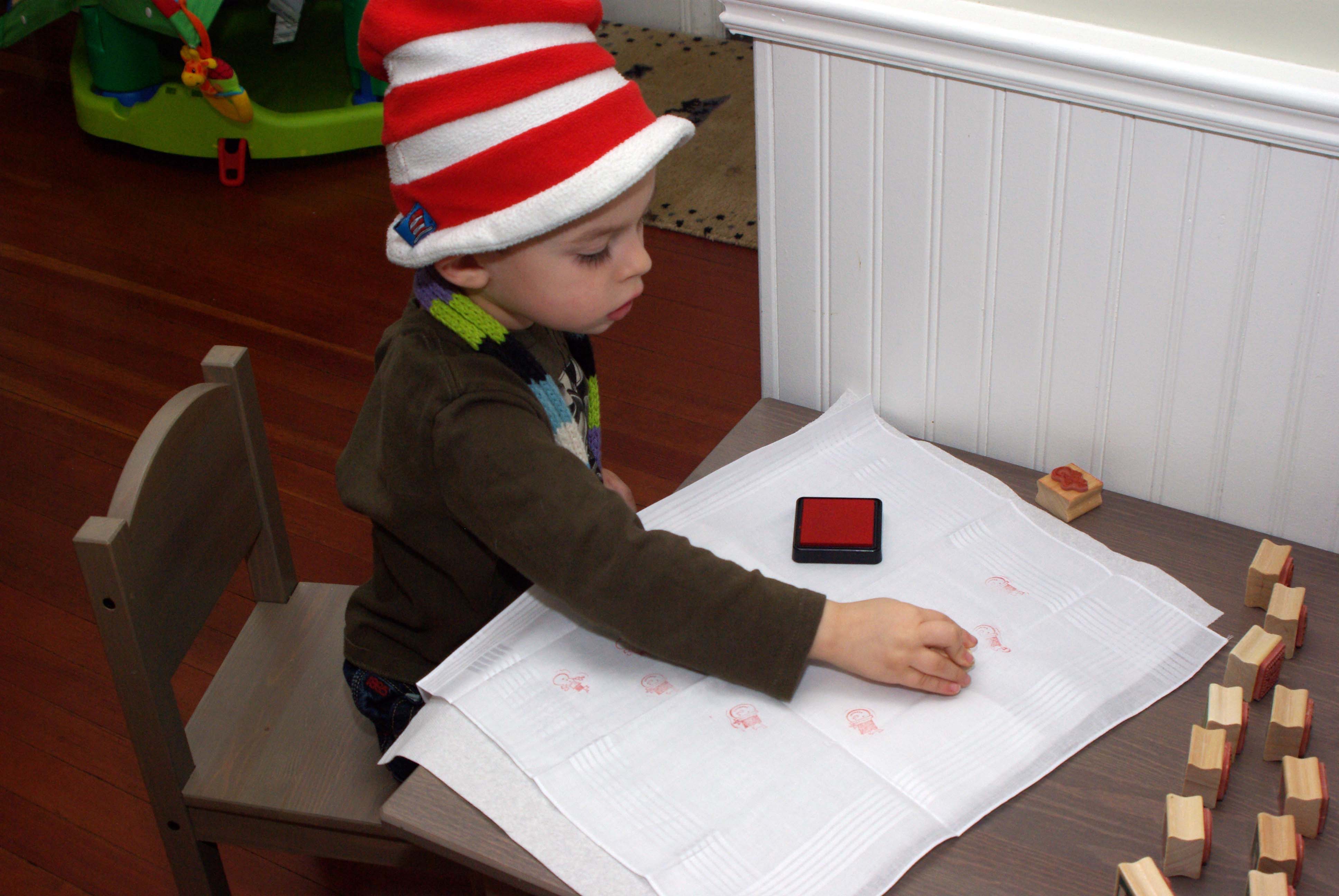 I may have created a little crafting monster over the last couple of months. My 3 year old seems to like making as much as I do. He has been busy making ornaments, cards, photo frames and most recently hankies. There is only one person that I know that uses hankies, so Sasha has been hard at work making Christmas hankies for Uncle John. Using store bought hankies, Sasha is embellishing them with stamps and ink, a perfect project for little hands.