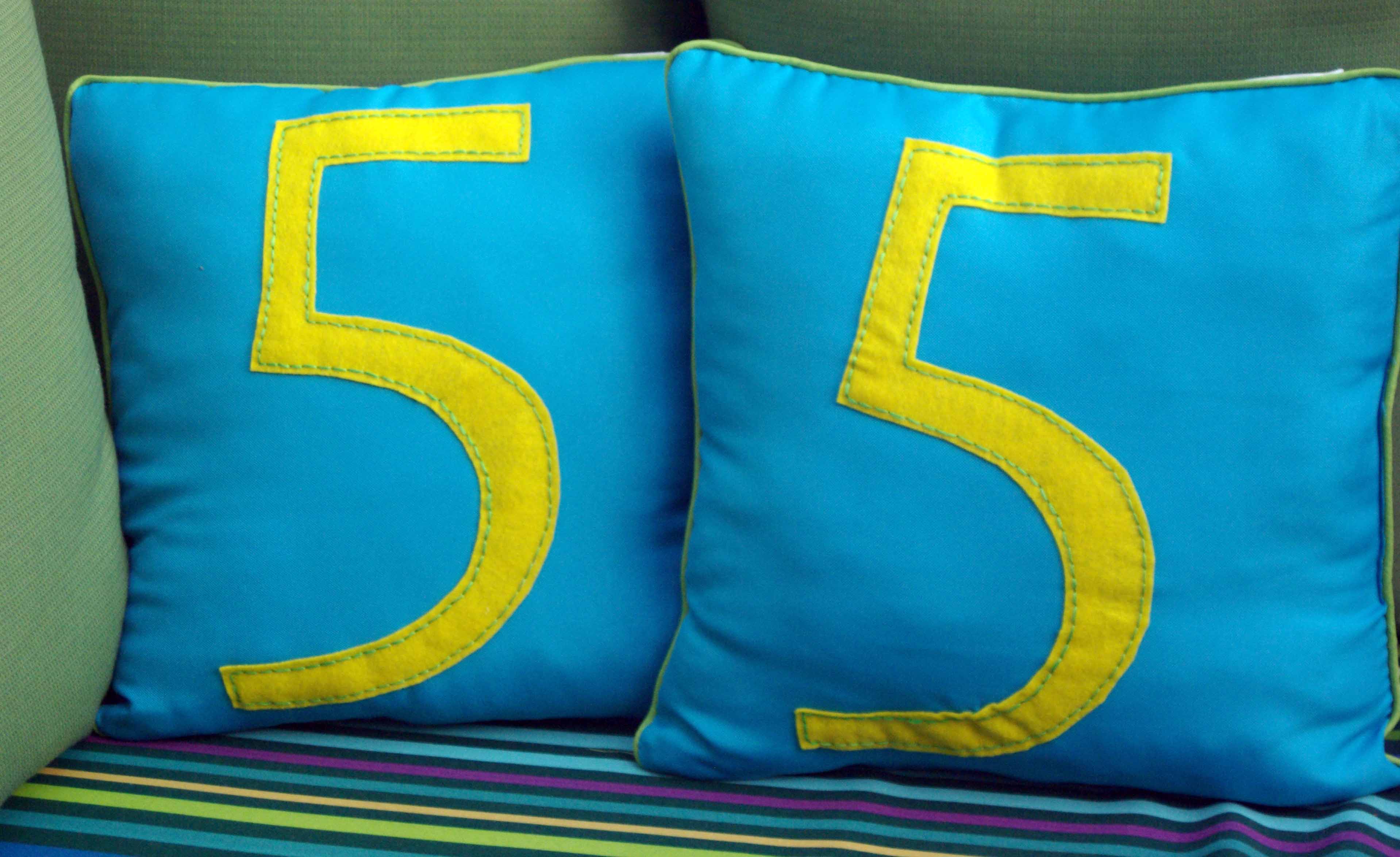 These were super easy to make. I bought the pillows already made because seriously who can make pillows for $9.00. Technology is my friend, I started with a font I liked in Word and then enlarged in on the printer until it was the right size. Then using a sheet of felt (not the little ones but a 36″x36″ sheet) purchased at Walmart for $5.00, I cut out the numbers. I pinned the felt numbers to the pillows and sewed then on with embroidery floss.