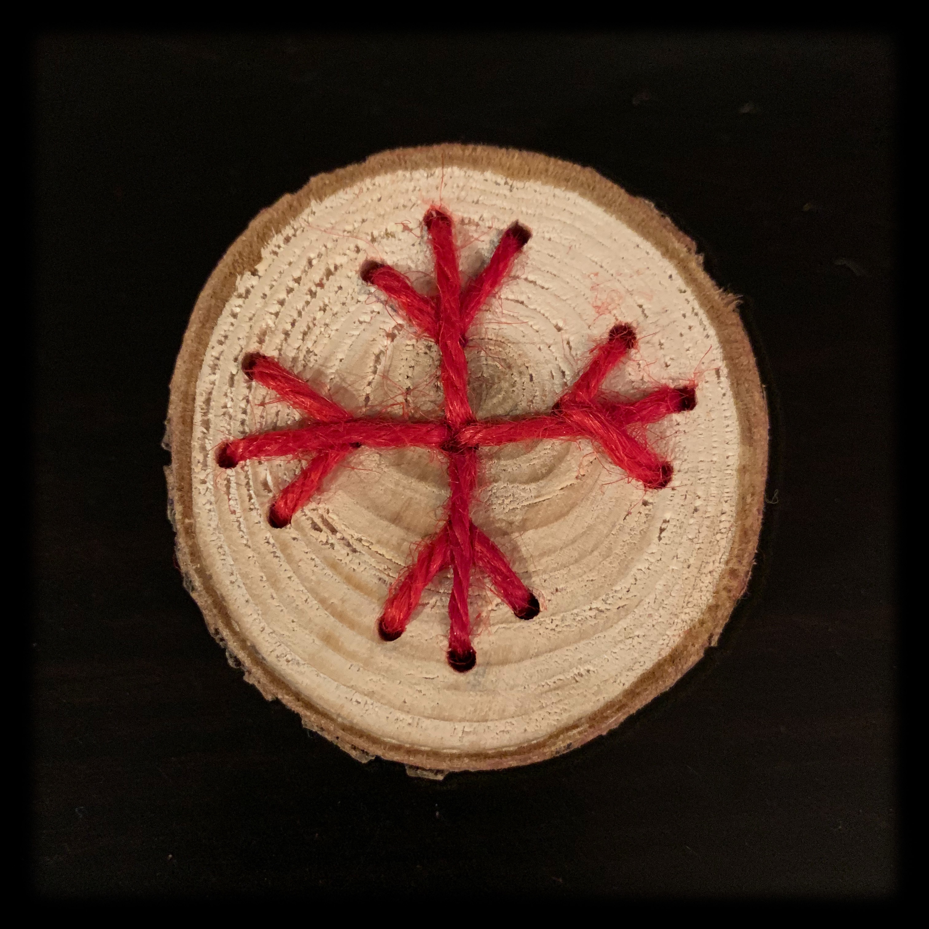 These are made from a tree branch from our yard. My husband cut these up into disks years ago after drying the branch for months. My son and I drew snowflakes on the wood discs and I drilled many, many holes. We sewed the snowflakes with red twine (from the dollar store) using a large needle. Then screwed hooks and added twine to hang them on the tree.
